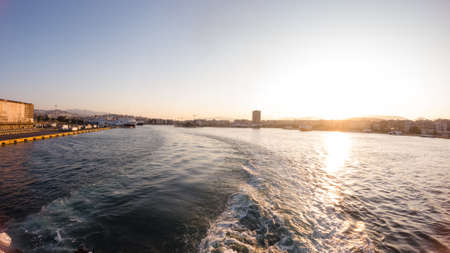 Crete, Greece - May 01, 2019: Yachts and ferry boat in the port of Heraklion. Panoramic and top view. Island of Crete, Greece
