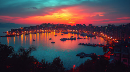 A panoramic view of a vibrant coastal city harbor at sunset, featuring numerous illuminated buildings, boats docked in the bay, and colorful sky reflections on the water surface.