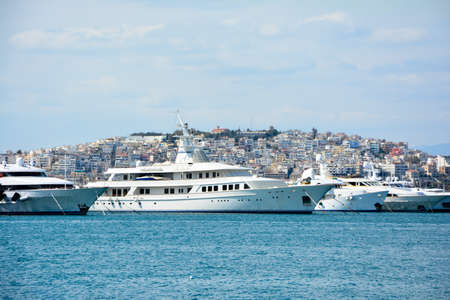 Large yachts moored in the harbor of Piraeus, Greece with city buildings in background