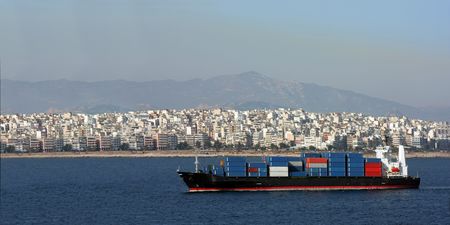 Port of Piraeus and Athens, Greece skyline. The largest Greek seaport, ship logos removed or blurred for commercial use