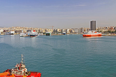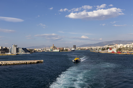 Piraeus, Greece - November 1, 2017: Port of Piraeus and cityscape of Athens, Greece. The port of Piraeus is the largest passenger port in Europe and the third largest in the world.