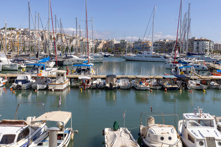 Athens, Piraeus, Greece - October 18, 2022: View of the port in the Bay of Zea (Pasalimani) with moored yachts on a beautiful sunny day