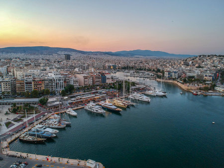 Aerial panorama view over Marina Zeas, Peiraeus city, Greece at sunset