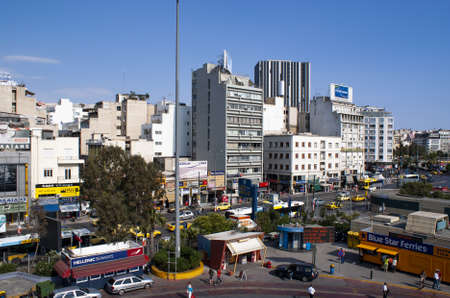 Piraeus port - Greece - May 27 2009 : High angle view of the busy, bustling Pireus quayside which is lined with shops and offices Landscape aspect shot