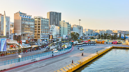 Piraeus, Athens, Greece - April 20, 2018: Buildings on seafront next to Piraeus port in Athens