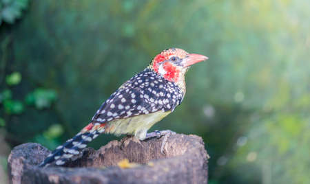 Bearded cabecirrojo, Red-and-yellow barbet perched on a log
