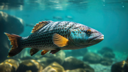 A vibrant freshwater fish gliding gracefully through clear water, surrounded by aquatic plants and shimmering bubbles, capturing the beauty of nature.