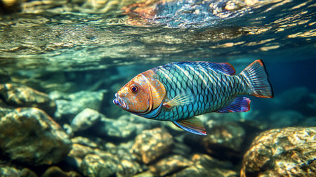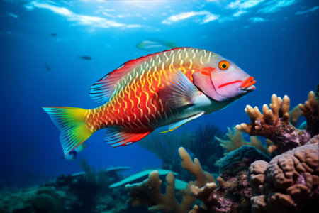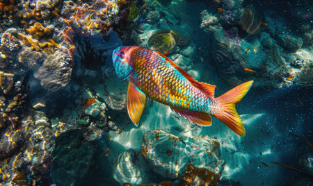 A stunning underwater scene featuring a vibrant colorful fish swimming gracefully among coral reefs, showcasing the beauty of marine life in its natural habitat.