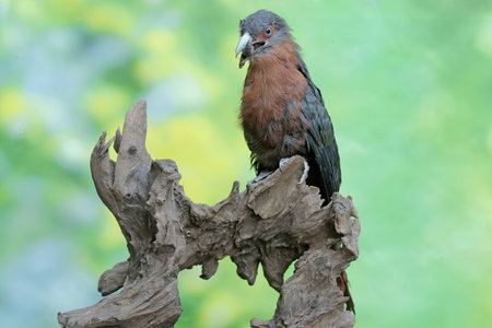 A young chestnut-breasted malkoha is preying on a large earthworm. This beautifully colored bird has the scientific name Phaenicophaeus curvirostris.