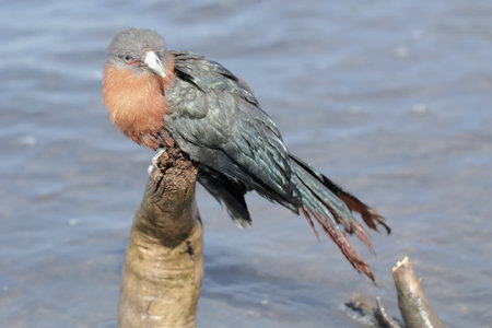 Vibrant bird displays bright plumage while resting on a rock in a tranquil habitat.