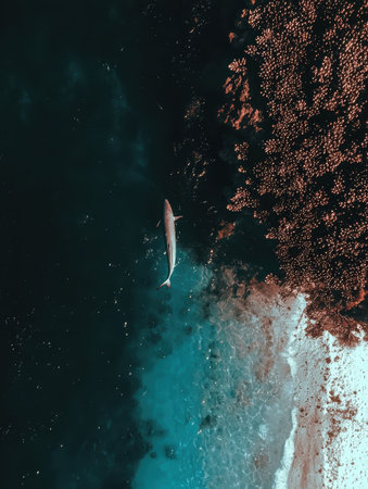 Majestic aerial view captures a lone shark swimming gracefully near the rocky shoreline, revealing the stunning contrast of blue waters and natural textures.