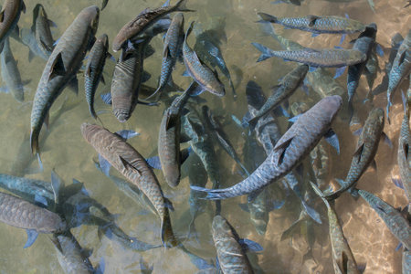 A lot of fishes are swimming in the aquatic crystal clear water.