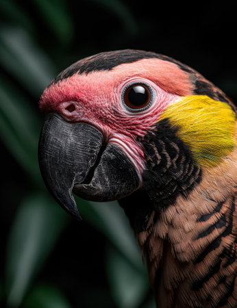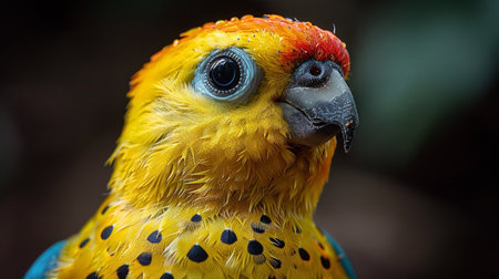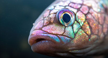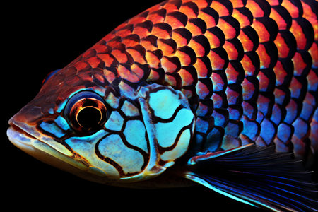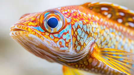 Close up of a brightly colored tropical fish, highlighting its intricate scale pattern and large eye