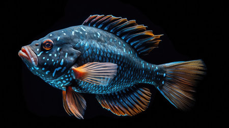 A colorful fish with a blue eye and orange fins. The fish is in a black background. The fish is the main focus of the image