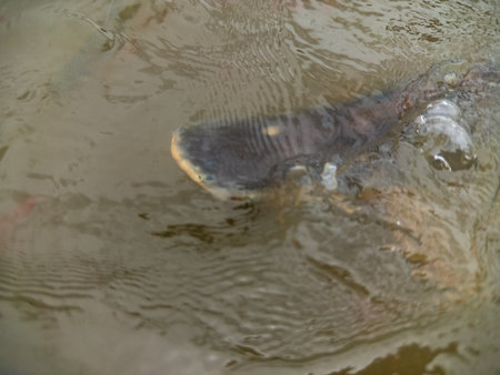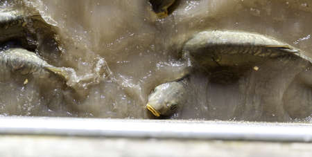 Carp fish in a pond in a farm. Selective focus.
