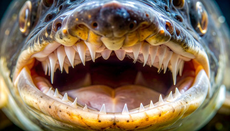 An extreme macro view into the menacing jaws of a piranha, revealing rows of razor-sharp teeth. This powerful image captures the raw, untamed danger lurking beneath the waters surface, a symbol of natures primal ferocity and the instinct for survival.