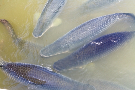 Live silver carps in the cage in fish breeding farm.