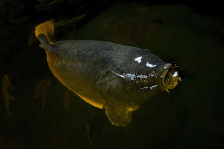 Portrait of arapaima gigas or pirarucu fish under water of tropical Amazon river. Wildlife at nature. Selective focus