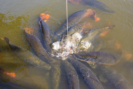 image of feeding many of wild carp fish in pond.