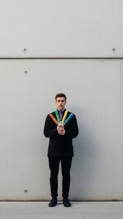 A stylish person wears a combination of layers and colors embodying selfexpression in front of a green canvas