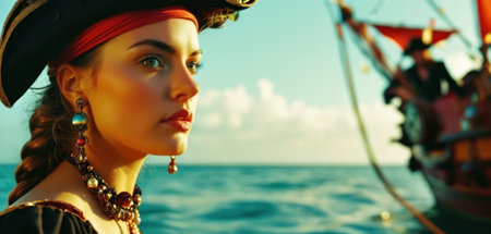 Adventurous Woman Dressed as a Pirate on a Ship at Sea Under Bright Sunshine.
