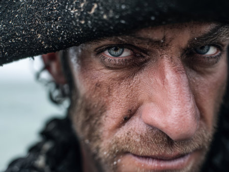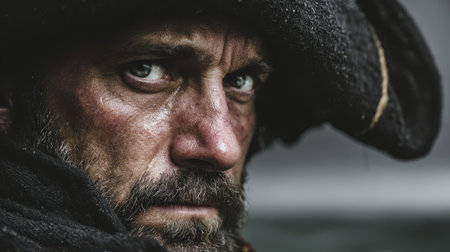 Rugged man with intense gaze wears a tricorn hat and dark cloak, evoking a historical or pirate theme. His weathered face shows determination and resilience in a dramatic close-up