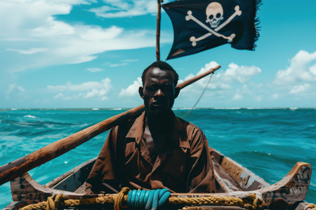 African man in a wooden canoe with a pirate flag at sea