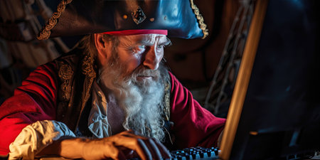 Old man with long white beard and mustache in pirate costume working on computer in dark room