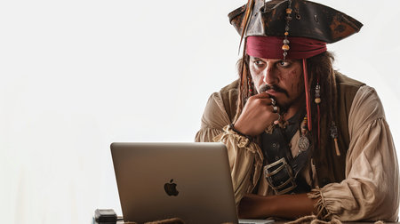 Portrait of a pirate with a laptop on a white background.