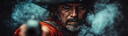 Pirate captain with smoking pistol in fog