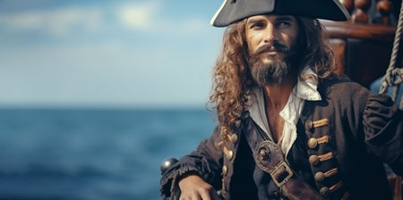 Male pirate on a ship against the backdrop of a calm sea with copy space. High quality photo