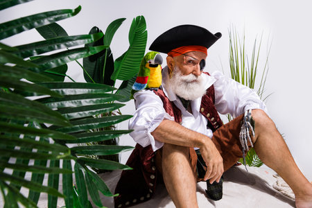 Elderly pirate character dressed as a buccaneer with colorful parrot on shoulder, surrounded by tropical plants, white background
