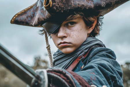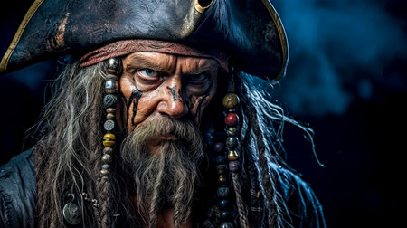 Portrait of a tough looking pirate wearing an eye patch and tricorn hat, posing against a dark background, conveying a sense of adventure and danger