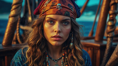 Pirate woman aboard ship with a determined look