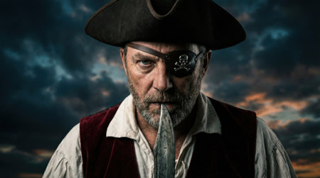 A close-up portrait of a fierce, rugged pirate with a beard and an eyepatch, holding a dagger in his teeth with a menacing stare against a dramatic, stormy sky at sunset.