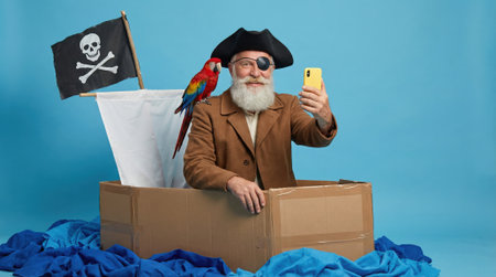 An elderly man with a white beard, eyepatch, and a parrot on his shoulder smiles while using a smartphone in a homemade cardboard ship against a blue background.
