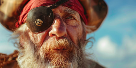 Intense and weathered stern pirate captain portrait with a closeup view. Featuring a rugged and grizzled old male with a fierce gaze and an eyepatch