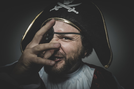 man pirate with eye patch and old hat with funny faces and expressive