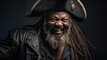 A seasoned pirate captain with long dreadlocks and a striking beard stares intently into the distance. Piracy is an activity committed by pirates, robbing ships on the seas, oceans. Generative AI.