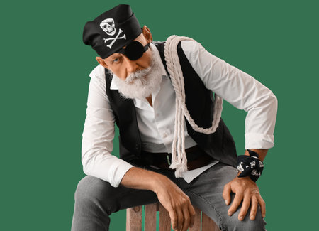 Old pirate with rope sitting on green background