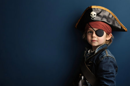 Child wearing an eye patch and a pirate hat, embodying adventure and imagination against a vibrant blue backdrop