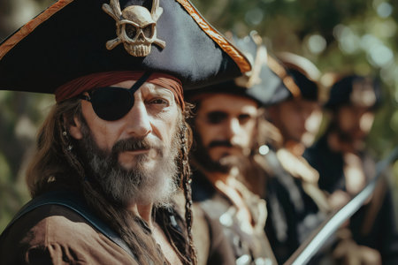Group of pirates wearing traditional costumes, including hats, swords, and eye patches, standing together outdoors