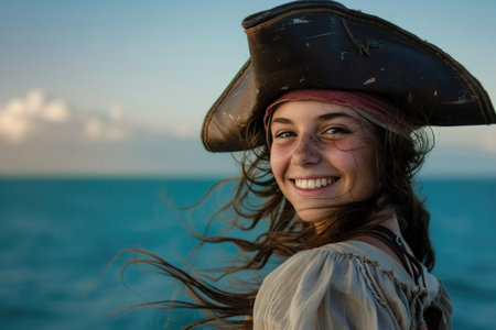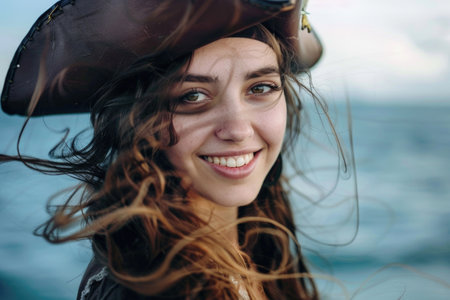 A young, smiling woman pirate in a hat, against an ocean backdrop, with windswept hair