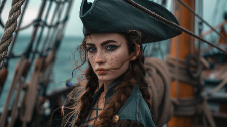 Mysterious pirate woman with braided hair and freckles