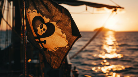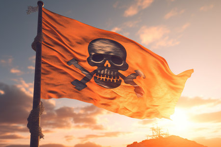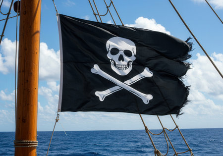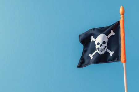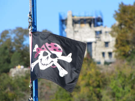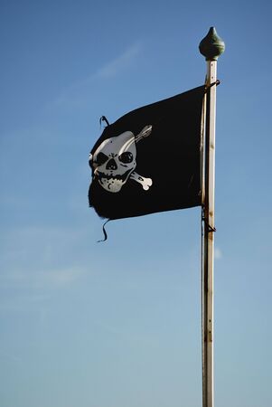 pirate flag waving in the wind against a blue sky. Marine paraphernalia