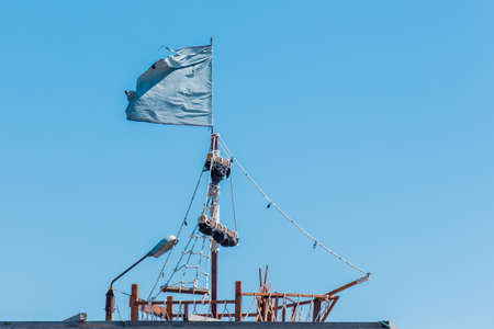 Flag on the ship sign and symbol of the sea cruise and adventure against the background of blue sky.