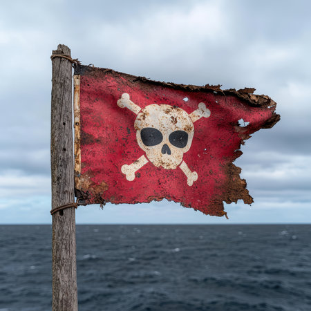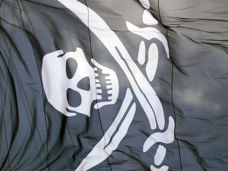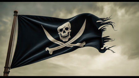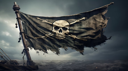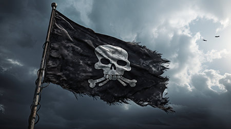 Ragged pirate flag with skull and crossbones flying from flagpole