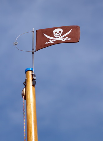 Jolly Roger skull and crossbones pirate flag upon a wood mast