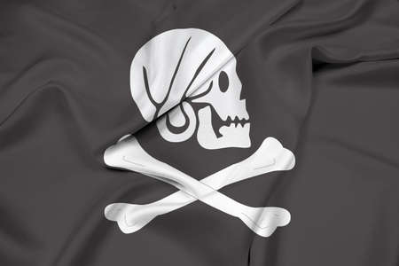 3D, fabric texture of the pirate skull with sabers flag waving in wind. Calico Jack pirate symbol for hacker and robber concept. Realistic flag of Pirates black on the wavy surface