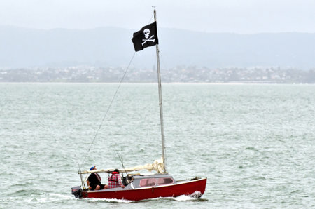 AUCKLAND - MARCH 18:A sail boat with Jolly Roger - Flag of a pirate skull and crossbones on March 18 2012 in Auckland Harbor, New Zealand.